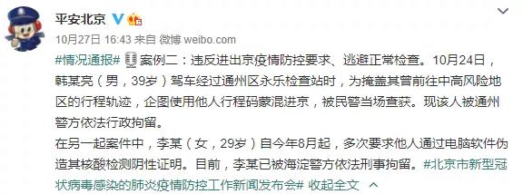 10月27日,北京市公安局副局长潘绪宏通报了违反进出京疫情防控要求、逃避正常检查的典型案例。