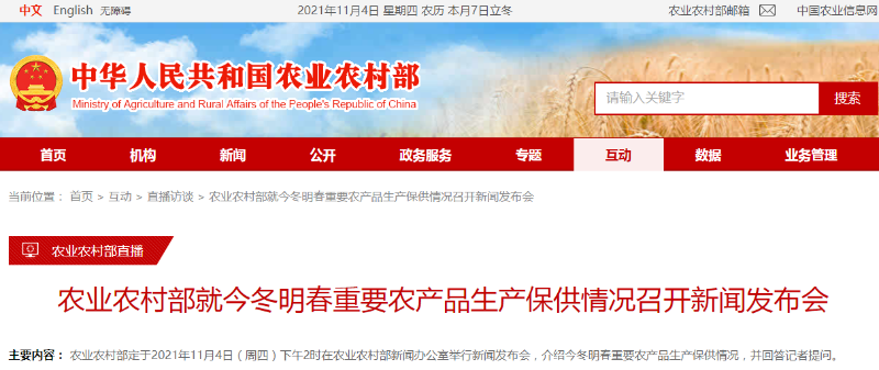 ▲11月4日下午,农业农村部举行新闻发布会,针对一些地区出现抢购粮油米面的情况,专门作出回应。图/农业农村部网站截图