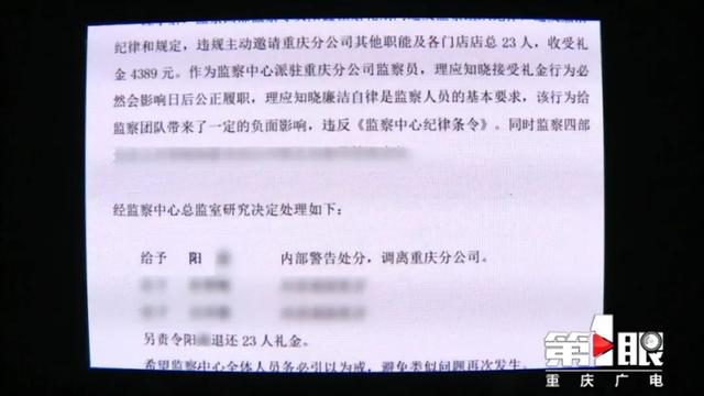 ▲9月26日,总公司资产保护中心发出文件,对阳先生作出内部警告和调离等处罚,并在全公司范围内进行了通报。图/重庆广电报道截图