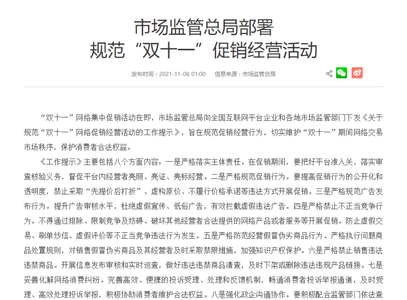 ▲近日,国家市场监管总局下发《关于规范“双十一”网络促销经营活动的工作提示》。图/国家市场监管总局网站截图