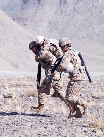 快到“敌”前沿据点时,小队长派出侦察小组抵近侦察。随后,他根据侦察员提供的战场情报,指挥队员绕过“敌”前沿据点,成功潜入“敌”指挥所附近区域。经过短暂休整,队员们对“敌”指挥所附近的一处断崖进行勘察,寻找渗透突破口。最终,他们利用绳索等工具,从断崖处完成渗透行动。
