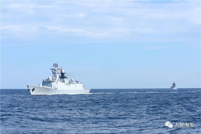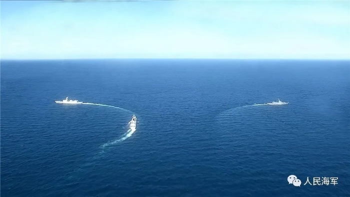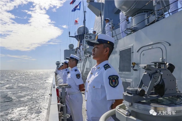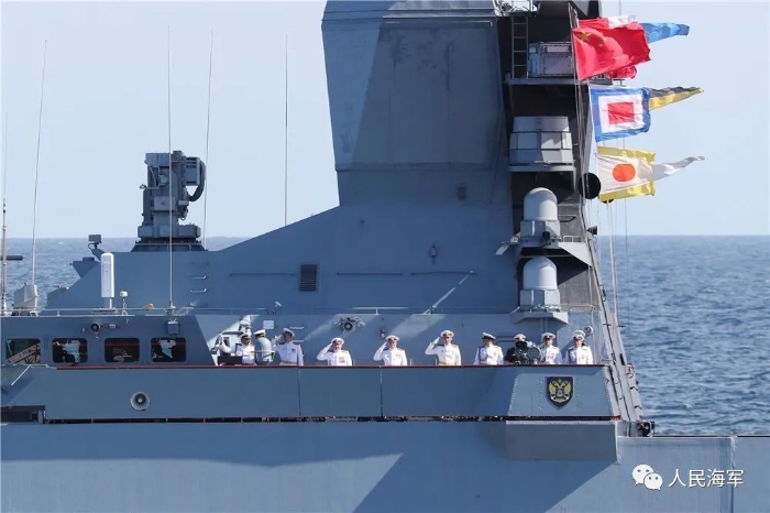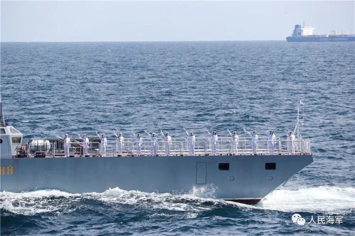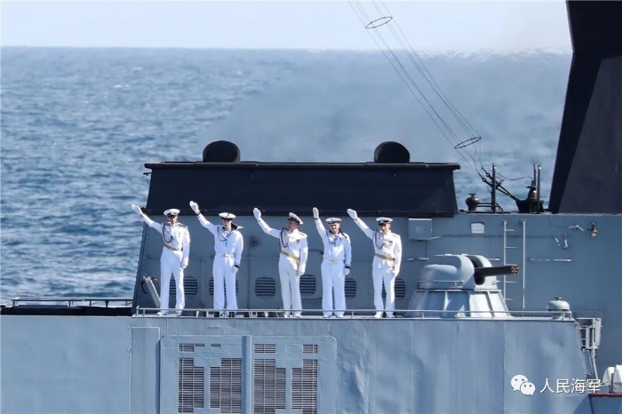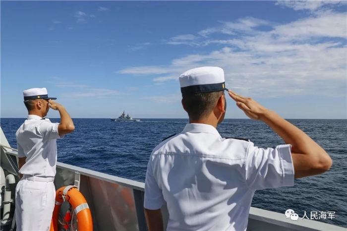 15时整,随着分航命令下达,邯郸舰信号兵挥动红黄手旗,3艘舰艇发射9枚绿色信号弹、同时鸣响汽笛,双方舰艇随即转向分航,两国海军官兵挥手道别。