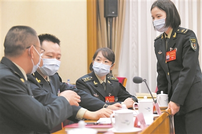 解放军和武警部队代表在分组讨论结束后交流学习心得。 本报记者 范显海摄