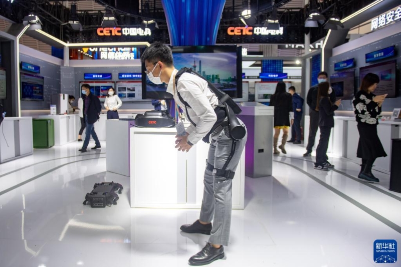 11月8日,中国电科工作人员为观众演示外骨骼机器人的使用。