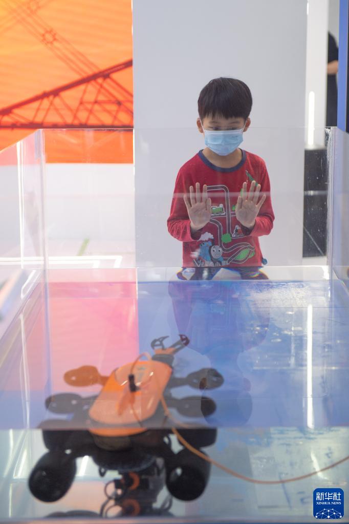11月8日,小朋友在国家电网展台参观水下机器人。