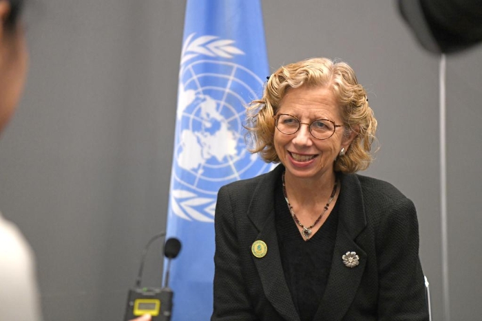 2022年12月16日,联合国环境规划署执行主任英厄·安诺生在加拿大蒙特利尔举行的《生物多样性公约》第十五次缔约方大会(COP15)第二阶段会议期间接受新华社记者专访。新华社记者