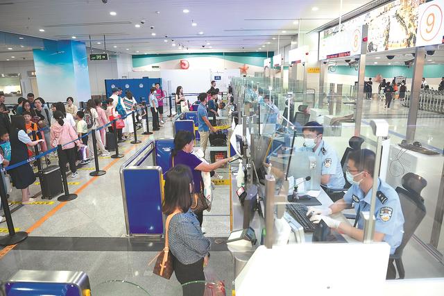 近日,在福州长乐国际机场出入境边防检查站,民警为入境旅客办理通关手续。截至6日23时,今年中秋、国庆“双节”期间,该站在福州长乐国际机场口岸共查验出入境人员近2.9万人次,同比增长约481%。其中入境约1.46万人次,同比增长约379%;出境1.42万人次,同比增长约645%。