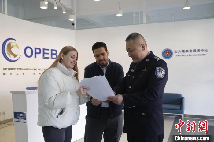 12月19日,中国首个海外人才离岸创新创业基地设立的出入境事务服务中心在天津正式启用,图为外籍人士在该中心咨询出入境等相关业务。 (天津市公安局出入境管理局供图)