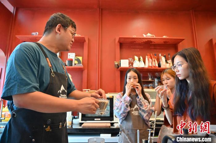 图为赵培渊向学徒讲解咖啡冲泡技艺。俞靖摄