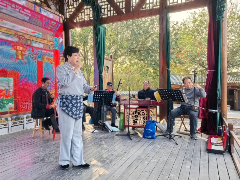 山东省东营市利津县盐窝镇南岭村的老戏台上,村民正在表演传统曲艺。新华社记者 袁敏 摄
