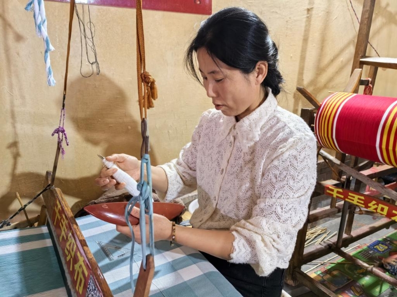 陈云生和妻子常在短视频平台上直播织布过程,并邀请线下的游客亲自动手体验传统织布工艺。“这是老祖宗留下的好东西,我们希望能让更多人看到。”他说。