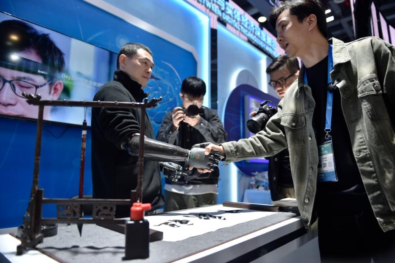 11月23日,在第二届全球数字贸易博览会上,观众在前沿趋势馆体验与穿戴智能仿生手的参展人员握手。新华社记者刘岭逸摄