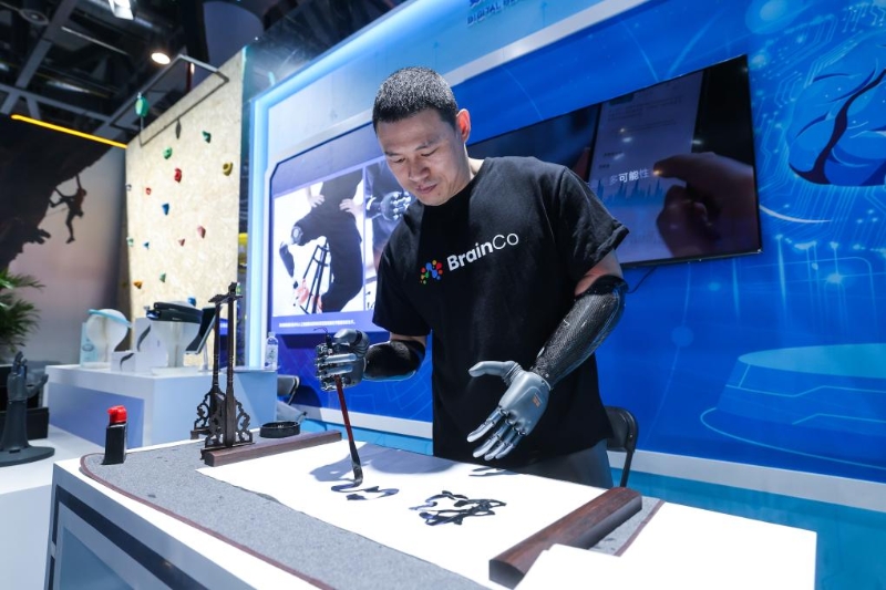 在展位现场,另一名上肢截肢的人士在使用强脑科技推出的智能仿生手。这也是基于非侵入式脑机接口技术的产品。使用者利用智能仿生手不但可轻松取物,还能写毛笔字。
