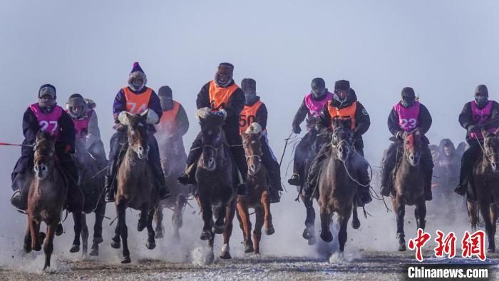 图为冰雪那达慕现场,牧民骑马驰骋。 吕昊俊 摄