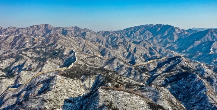 这是2023年12月18日拍摄的雪后北京八达岭长城(无人机照片)。新华社发(刘宇摄)