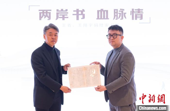 3月12日,“两岸书 血脉情——王省、王翔宇捐赠家书展”开展仪式在南京孙中山纪念馆举行。图为王省的儿子王翔宇(右)和孙中山纪念馆馆长梅宁在开展仪式上。 中新社记者 泱波 摄