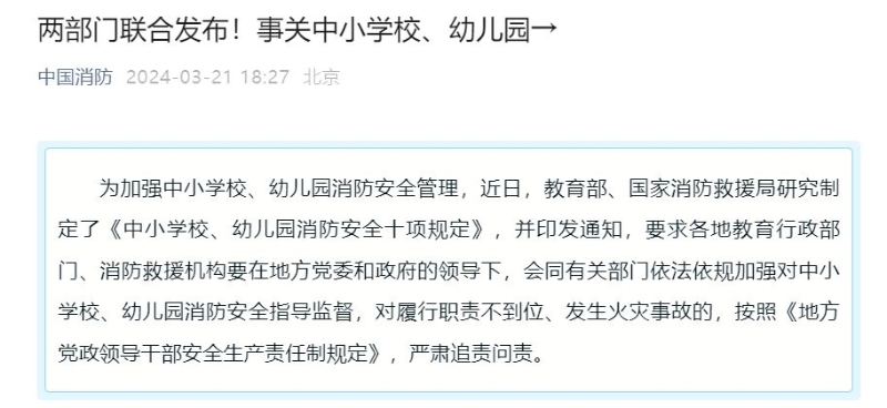 为加强中小学校、幼儿园消防安全管理,近日,教育部、国家消防救援局研究制定了《中小学校、幼儿园消防安全十项规定》,并印发通知,要求各地教育行政部门、消防救援机构要在地方党委和政府的领导下,会同有关部门依法依规加强对中小学校、幼儿园消防安全指导监督,对履行职责不到位、发生火灾事故的,按照《地方党政领导干部安全生产责任制规定》,严肃追责问责。