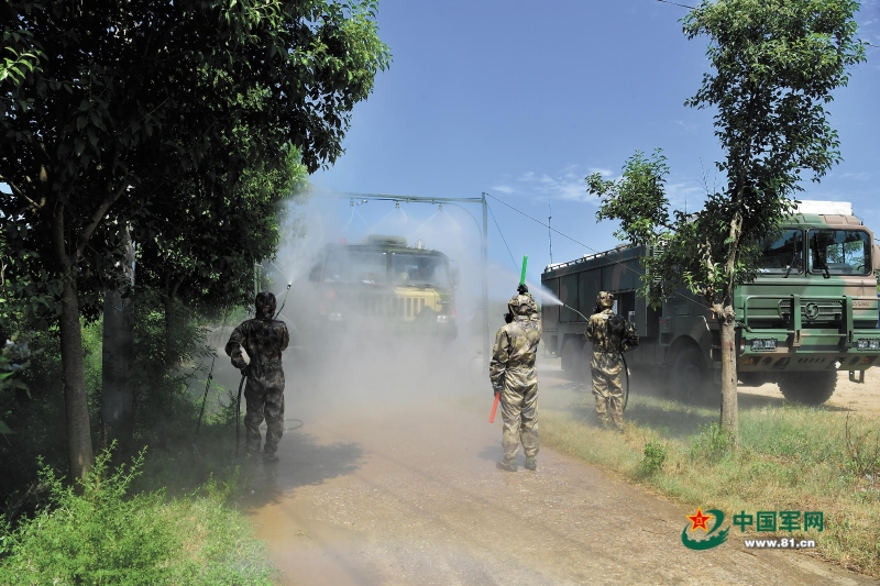火箭军某旅进行装备车辆洗消训练。李万强摄