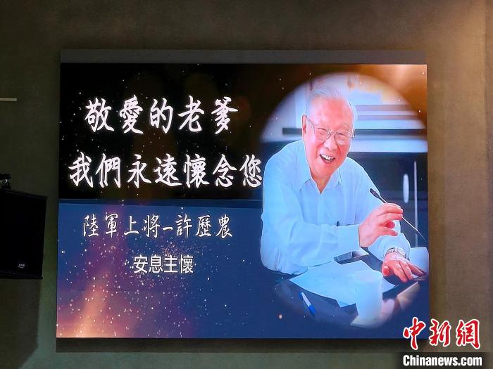 5月24日,黄埔学员、台湾退役将领许历农的告别式在台北市怀爱馆景明厅举行。图为厅内屏幕上播放写有“敬爱的老爹 我们永远怀念您”字幕的视频。中新社记者 张晓曦 摄