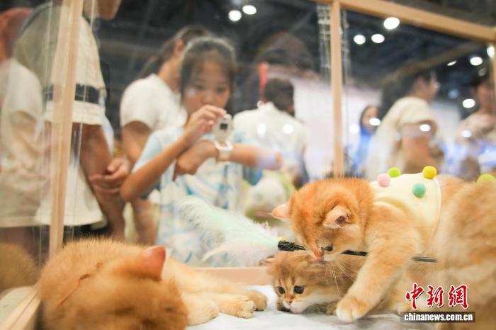 8月9日,正在广西南宁国际会展中心举行的宠物展吸引不少参观者。图为儿童用电话手表拍摄猫咪。中新社记者 陈冠言 摄