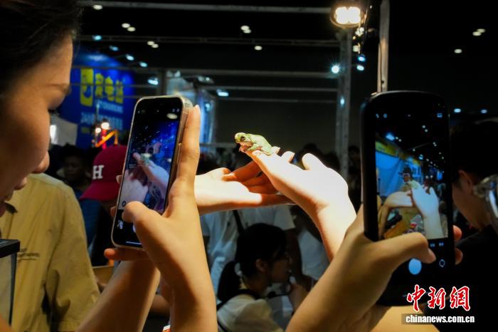8月9日,正在广西南宁国际会展中心举行的宠物展吸引不少参观者。图为参观者手捧一只树蛙拍照。中新社记者 陈冠言 摄