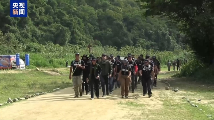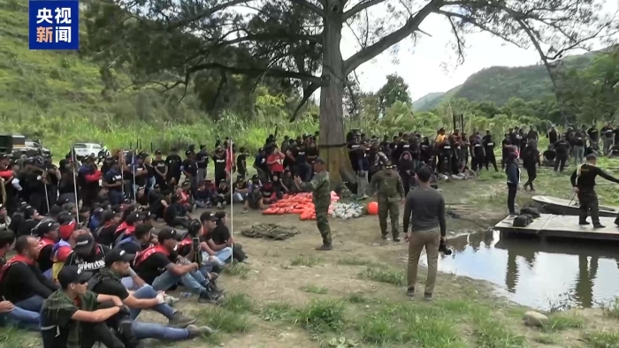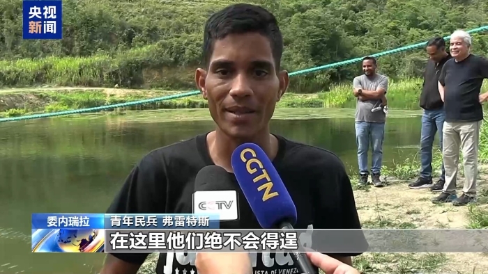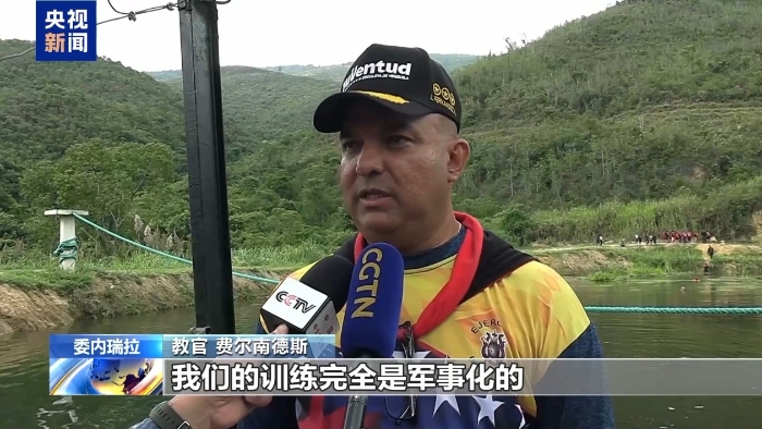 总台记者 宫祥诚:这里是一处民兵训练营,位于首都加拉加斯大约有30分钟车程的距离。我们可以看到周围被群山环绕,是一个比较隔绝的地方,这里正有300多名来自委内瑞拉全国各地的此前接受应征加入民兵组织的年轻人正在接受军事理论的学习。他们马上就要行进到附近的一个湖泊,进行水上作战的训练。