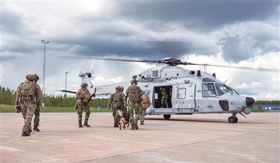参加北约联合演习的美国和瑞典空军人员登上NH-90直升机。