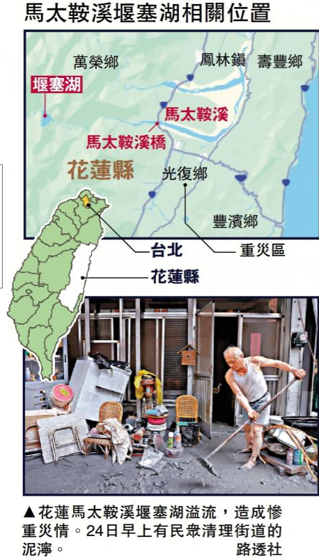 图:花莲马太鞍溪堰塞湖溢流,造成惨重灾情。24日早上有民众清理街道的泥泞。\路透社