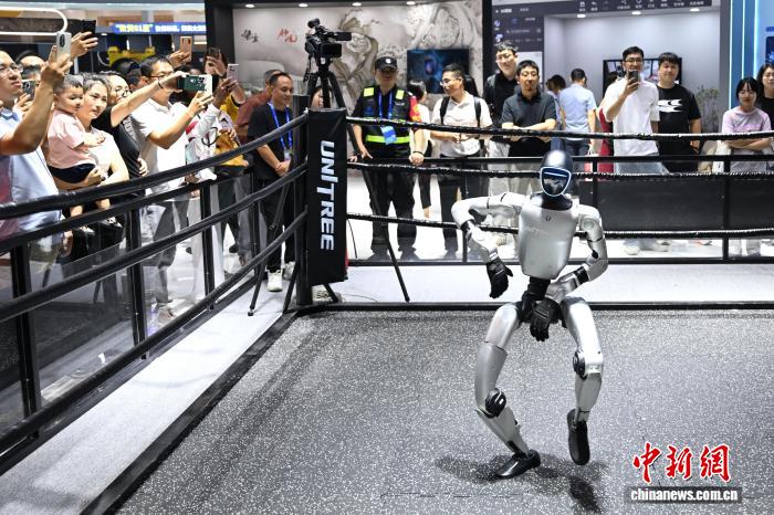 9月25日,参观者欣赏宇树人形机器人跳舞表演。当日,第四届全球数字贸易博览会展览对公众开放,展出的AR应用、机器人应用等吸引参观者。中新社记者 王刚 摄