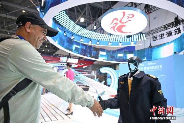 9月25日,外籍参观者和长龙航空“机器人机长”互动。当日,第四届全球数字贸易博览会展览对公众开放,展出的AR应用、机器人应用等吸引参观者。中新社记者 王刚 摄