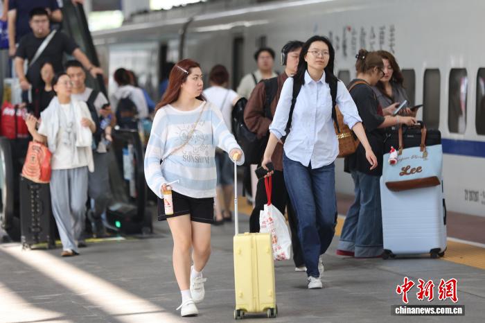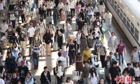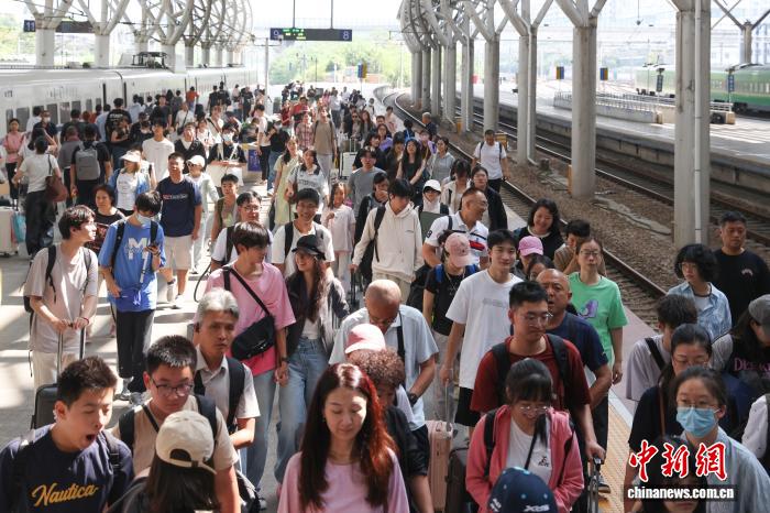 10月8日,江苏南京,旅客们在火车站出行。当日是国庆中秋假期最后一天,长三角铁路迎来返程客流最高峰。中新社记者 泱波 摄