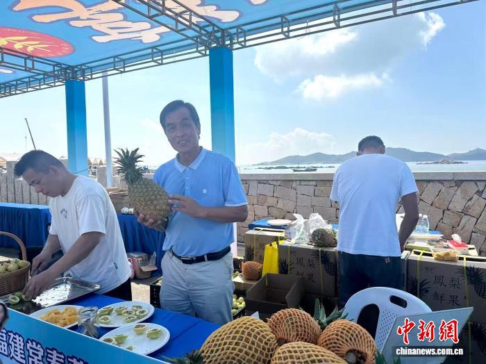 12日,台湾农场主王森谅(中)携特色品种台湾“西瓜凤梨”参加福州市2025年中国农民丰收节福清分会场。郑江洛 摄