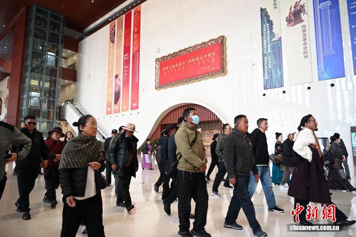 10月12日,内蒙古呼和浩特市,海外归国定居藏胞在内蒙古博物院参观。当日,“侨连五洲·海外归国定居藏胞代表人士国情教育活动”在呼和浩特进入第一天行程。40余位海外归国定居藏胞代表,接下来将用近一周时间,在呼和浩特、包头、鄂尔多斯3地,直观了解内蒙古的人文历史、生态建设与现代产业等方面内容。中新社记者 刘文华 摄