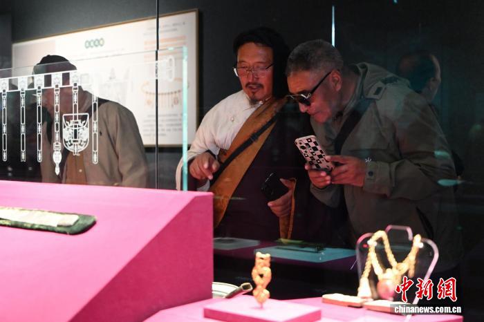 10月12日,内蒙古呼和浩特市,海外归国定居藏胞在内蒙古博物院参观辽代金饰。当日,“侨连五洲·海外归国定居藏胞代表人士国情教育活动”在呼和浩特进入第一天行程。40余位海外归国定居藏胞代表,接下来将用近一周时间,在呼和浩特、包头、鄂尔多斯3地,直观了解内蒙古的人文历史、生态建设与现代产业等方面内容。中新社记者 刘文华 摄