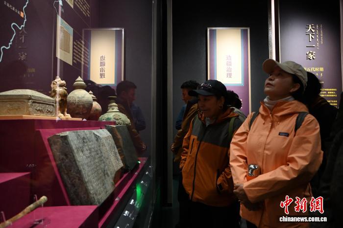 10月12日,内蒙古呼和浩特市,海外归国定居藏胞在内蒙古博物院了解隋唐历史。当日,“侨连五洲·海外归国定居藏胞代表人士国情教育活动”在呼和浩特进入第一天行程。40余位海外归国定居藏胞代表,接下来将用近一周时间,在呼和浩特、包头、鄂尔多斯3地,直观了解内蒙古的人文历史、生态建设与现代产业等方面内容。中新社记者 刘文华 摄