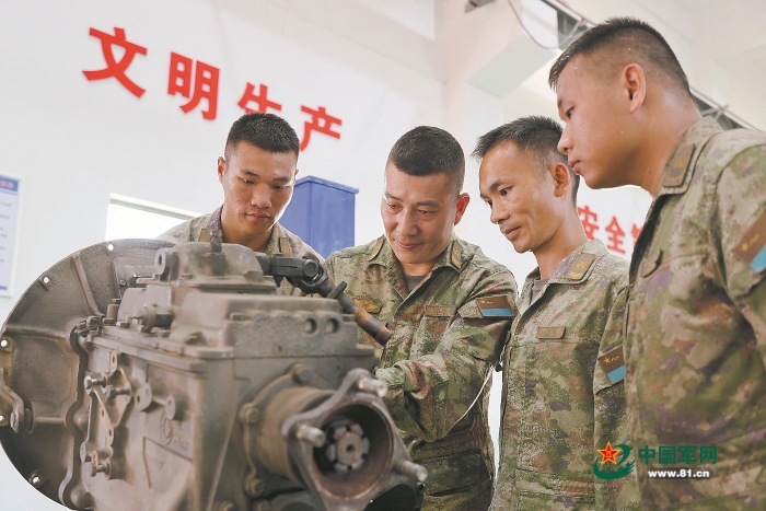 修理兵、二级军士长顾迎超(左二)进行实操示范教学。胡潇潆 摄