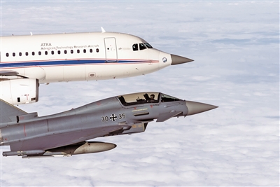 上图中,一架客机正在一架EF2000“台风”战斗机的护航下飞行。奇怪的是,这架客机机头装着与“台风”战斗机一样的尖头机鼻。这是怎么回事呢?