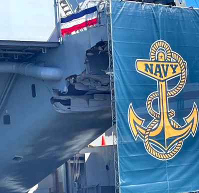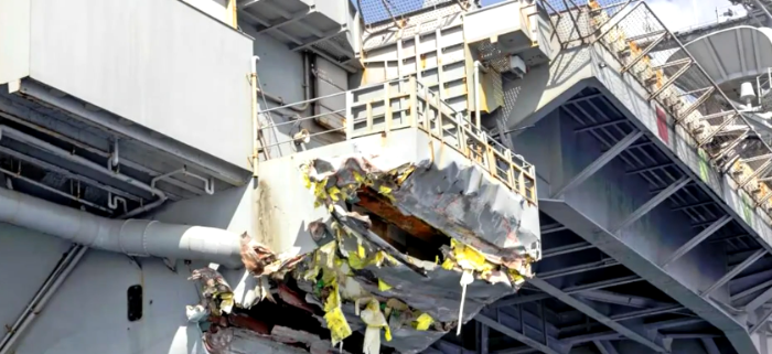 今年2月,“杜鲁门”号在埃及塞得港与一艘商船发生碰撞事故,造成航母右舷升降机附近船舷出现明显凹痕,周边管道严重变形。当时,美国海军并未透露“杜鲁门”号的具体受损情况,只表示碰撞造成水线以上损伤、未影响核反应堆安全,“不影响作战能力”。