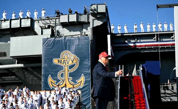 10月5日,诺福克海军基地举办美国海军成立250周年庆典。一名在场的美军水手向“商业内幕”网站提供的照片显示,特朗普身旁的“杜鲁门”号航母悬挂着巨幅海报,而海报恰好遮住了该舰此前碰撞受损的部位。
