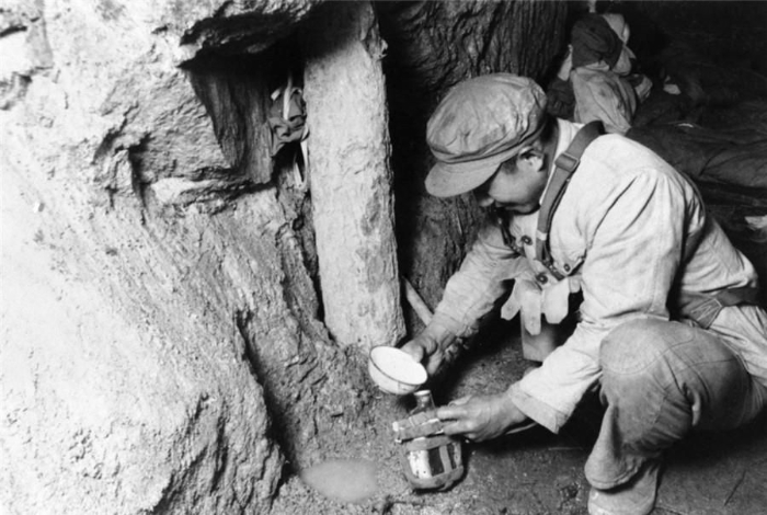1952年,在上甘岭战役中坚守在坑道中的中国人民志愿军战士积蓄坑道岩壁上的渗水,以解决缺水问题。