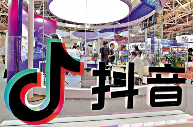 图:台当局企图禁止中小学生在校园内使用TikTok,被批评是鸵鸟心态。图为在福州市一展会上,主办方设置的抖音直播间。/资料图片