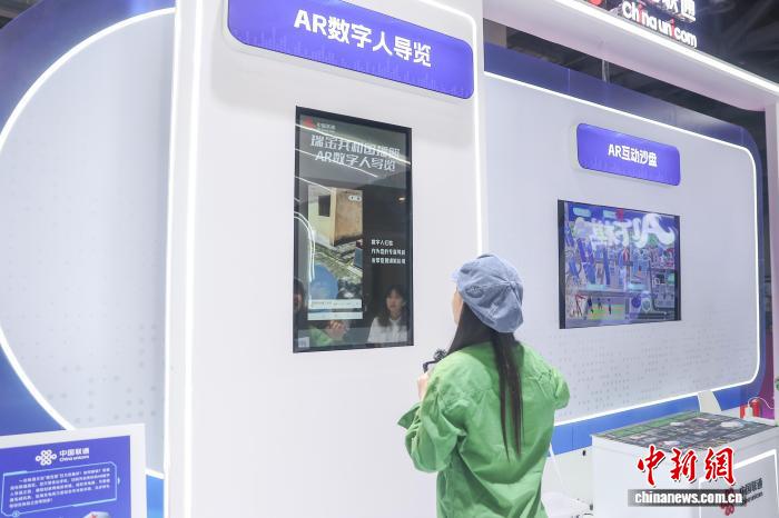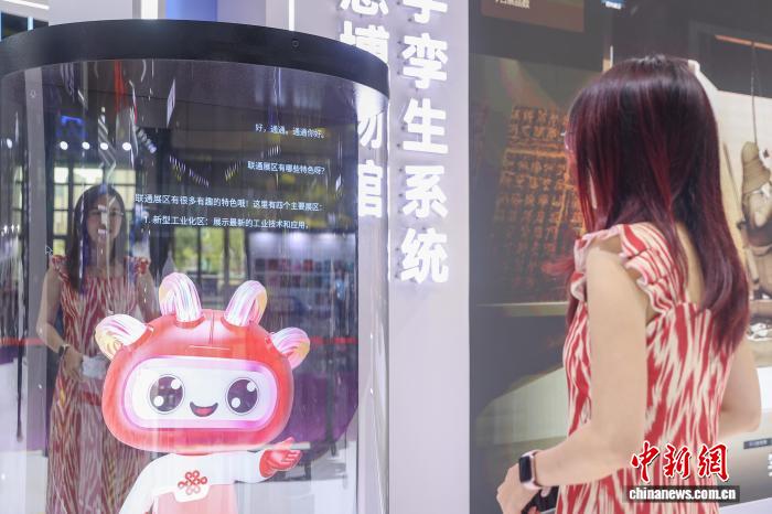 10月18日,江西南昌红谷滩区,观众在中国联通展厅与数字人“通通”对话,“通通”是通过全息舱呈现的可感知、可对话的AI数字人。中新社记者 刘力鑫 摄