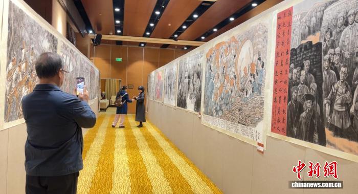 台湾书画家欧阳鲲带来的书画作品《乙未战争》,描绘《马关条约》签订后台湾民众在日军登陆后奋起抵抗的景象。欧阳鲲受访表示,画家的创作技巧多种多样,但历史真相只有一个,和平年代更要铭记历史。