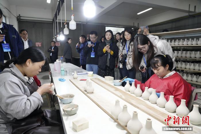 10月19日,河南平顶山汝州,参加“中国式现代化发展看河南”2025两岸媒体联合采访活动的数十位媒体人、自媒体从业者等走进中国汝瓷博物馆和汝瓷生产企业,感受千年汝瓷文化。图为台湾自媒体从业者探讨汝瓷生产过程。王佳宁 摄