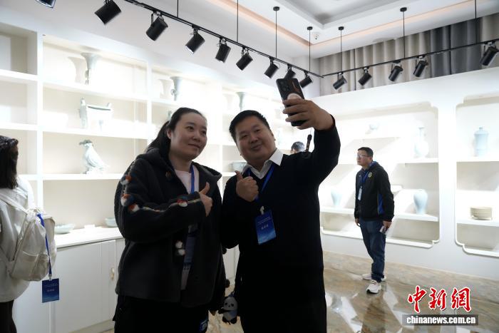10月19日,河南平顶山汝州,参加“中国式现代化发展看河南”2025两岸媒体联合采访活动的数十位媒体人、自媒体从业者等走进中国汝瓷博物馆和汝瓷生产企业,感受千年汝瓷文化。图为台湾自媒体从业者欣赏汝瓷。王佳宁 摄