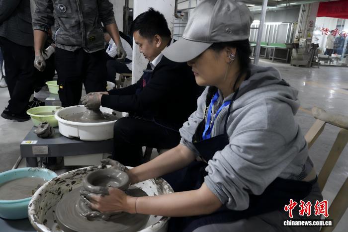10月19日,河南平顶山汝州,参加“中国式现代化发展看河南”2025两岸媒体联合采访活动的数十位媒体人、自媒体从业者等走进中国汝瓷博物馆和汝瓷生产企业,感受千年汝瓷文化。图为台湾媒体人体验汝瓷制作过程。王佳宁 摄