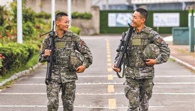 武警贵州总队安顺支队积极构建和谐纯洁内部关系。图为近日,两名战士在训练结束后,开心地分享各自收获。唐忠飞摄
