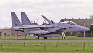 日本F-15J战斗机降落在英国科宁斯比空军基地。
