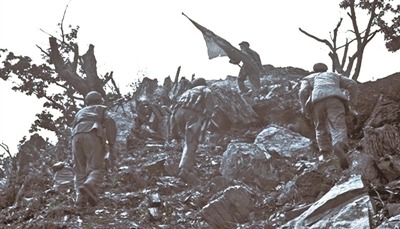 1953年夏季反击战役中,志愿军官兵把胜利的红旗插上十字架山主峰。资料照片