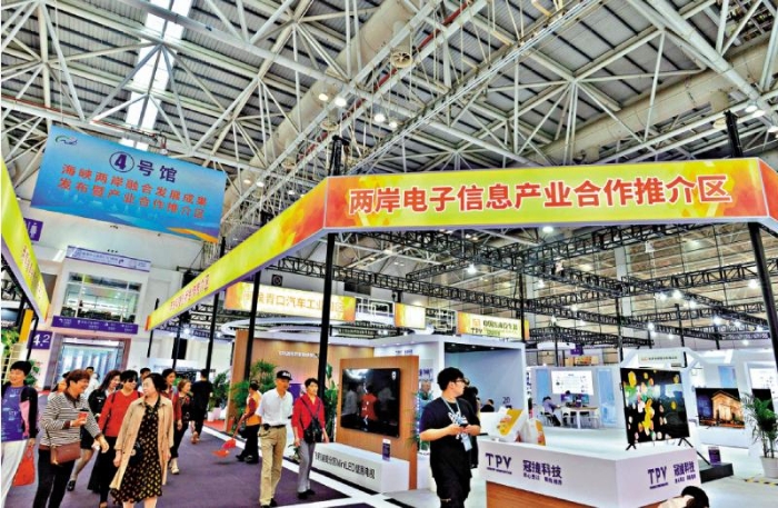 图:“十五五”时期大陆经济社会高质量发展将为广大台胞台企发展提供更多机遇,有利进一步加强两岸经合。图为在福州举行的海交会两岸电子信息产业合作推介区。/资料图片